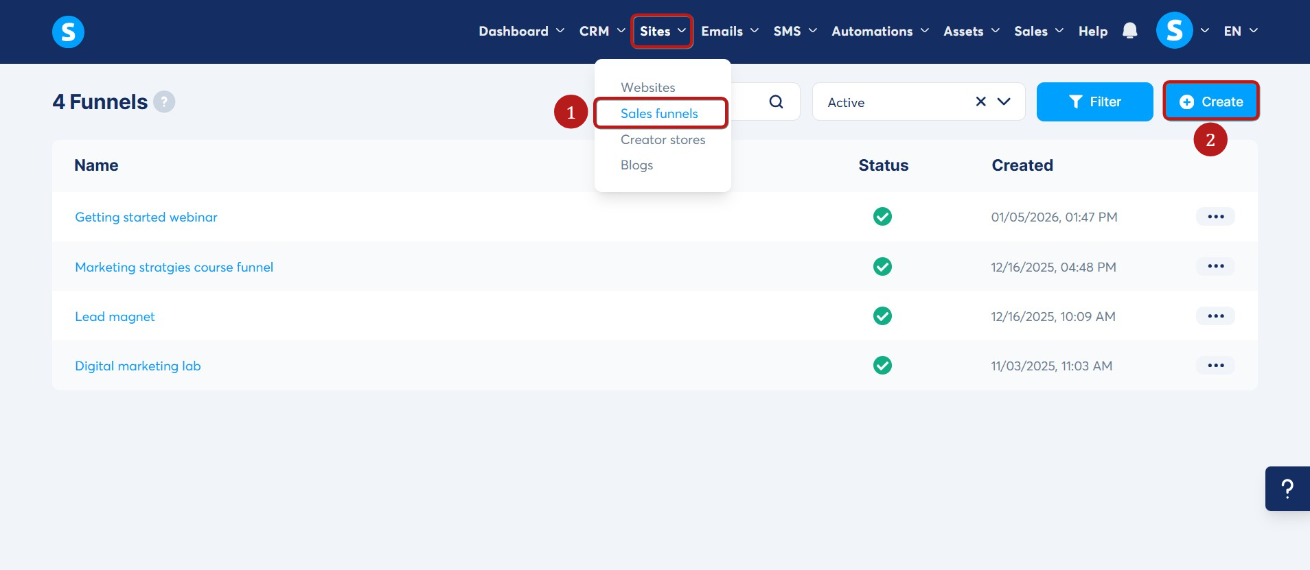 Щоб створити свою воронку, перейдіть до вкладки Воронки продажів (1) та натисніть Створити (2).
