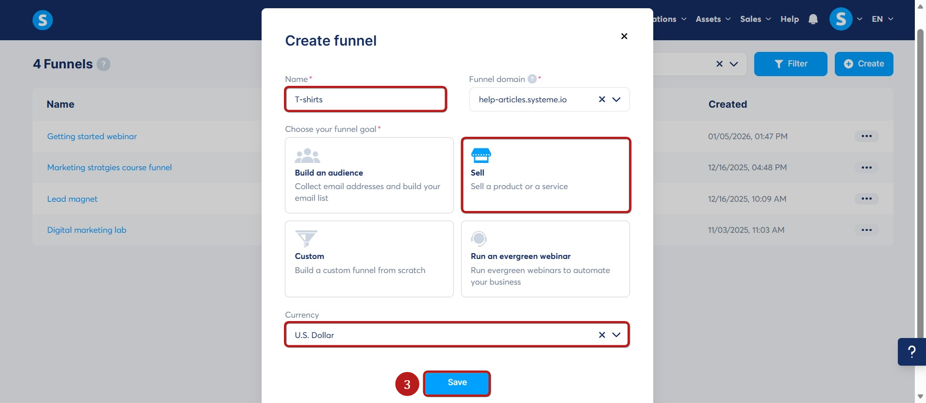Дайте назву своїй воронці, виберіть валюту та натисніть Зберегти (3).