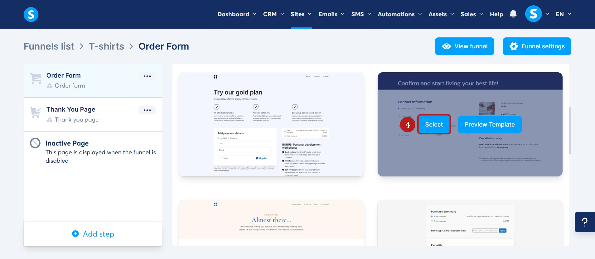 Щоб продавати продукти, вам потрібна форма замовлення та сторінка подяки (вибравши шаблон Продати, ви вже матимете ці дві сторінки у воронці). Ви також можете додати сторінку підписки, сторінку продажів і навіть сторінки допродажу та знижки, відповідно до ваших потреб.