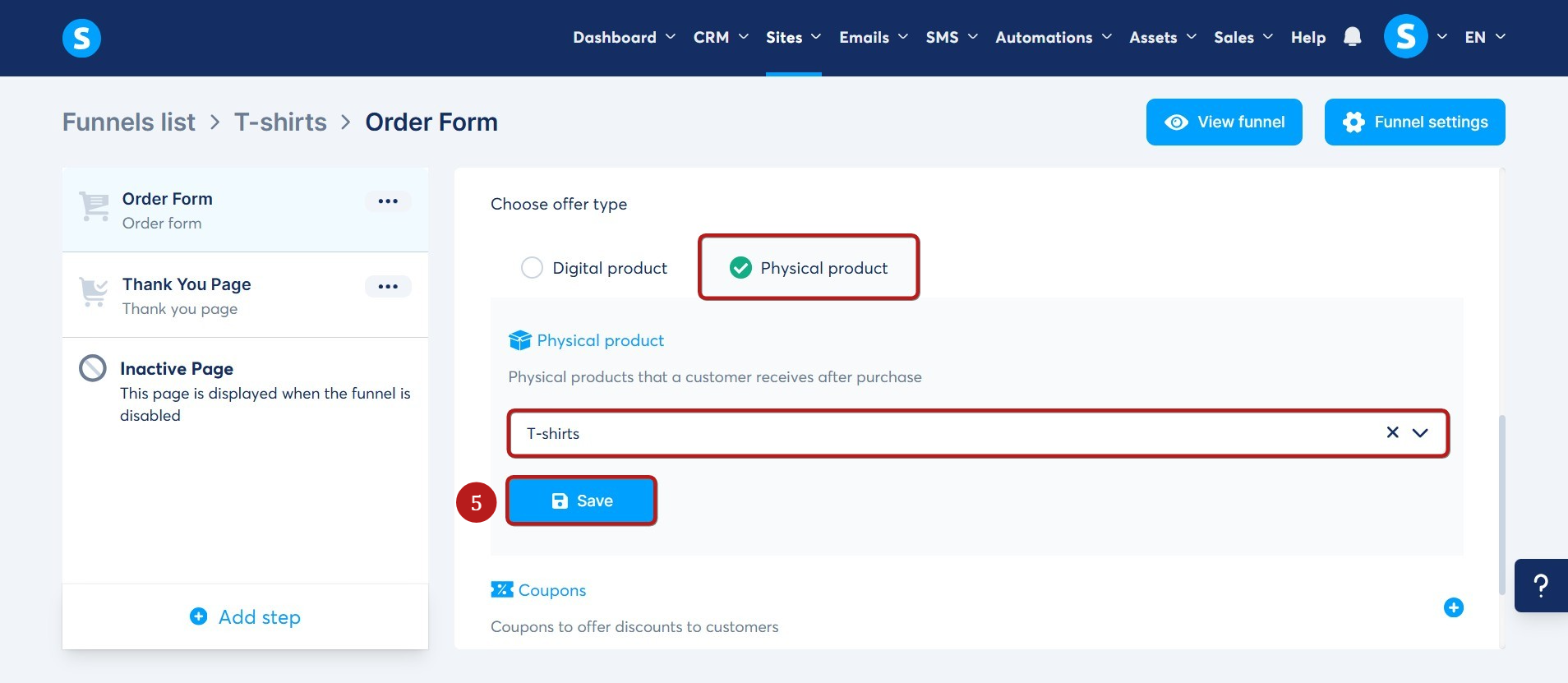 Виберіть Фізичний товар як тип пропозиції. Потім оберіть свій конкретний товар (наприклад, "Футболки") та натисніть Зберегти (5).