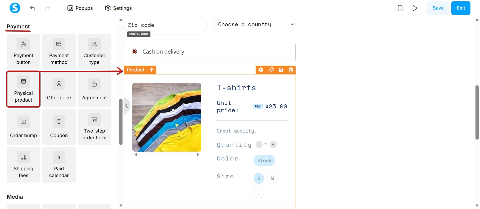 Потім перетягніть елемент Фізичний продукт на лівій стороні редактора в розділі Оплата і помістіть його на сторінку.