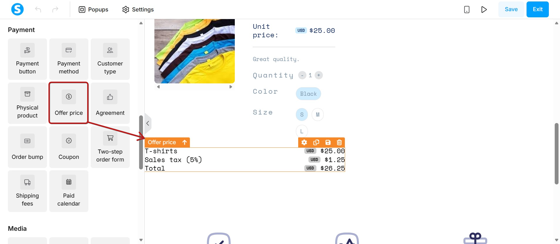 Після того, як ви налаштували ваш продукт на сторінці, настав час додати ціни. Перетягніть і помістіть елемент Ціна пропозиції, який також знаходиться в розділі Оплата.