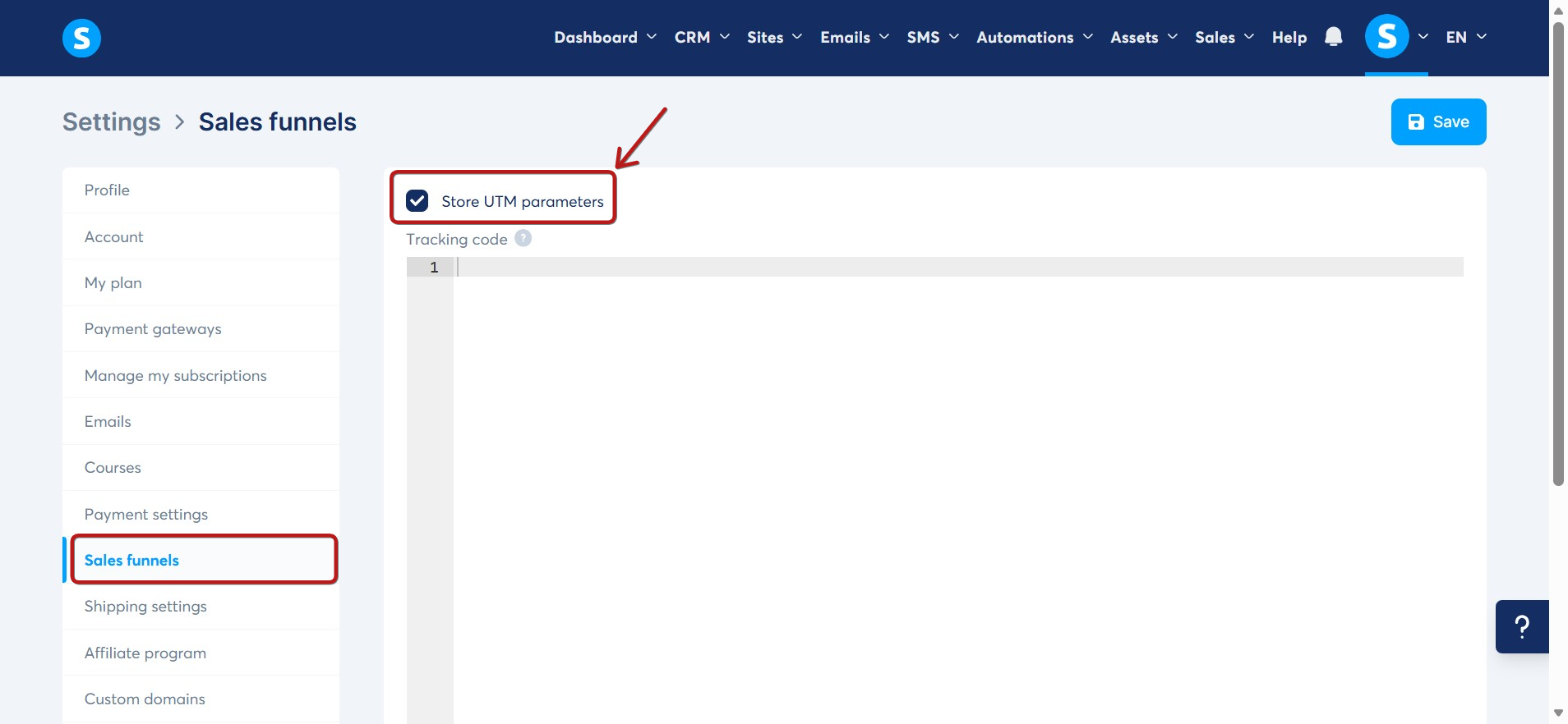 Щоб збирати UTM-параметри, пов'язані з вашими контактами, встановіть прапорець опції Зберігати UTM-параметри на сторінці налаштувань воронки продажів.