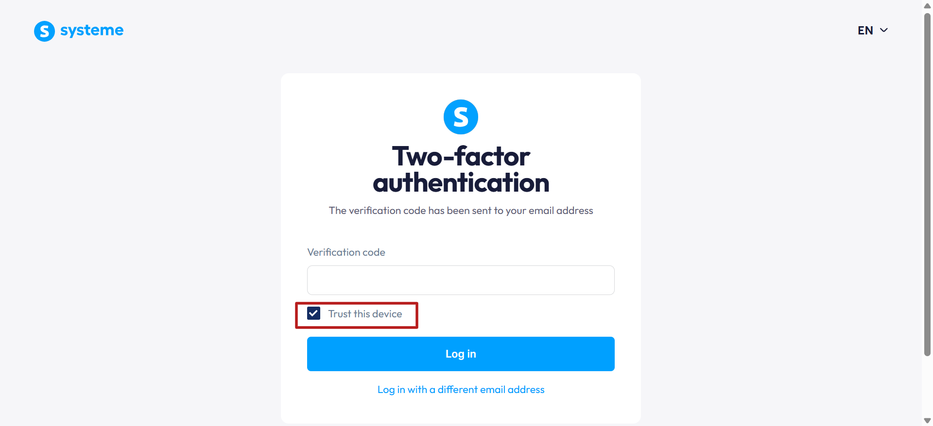 Цей метод вимагає другої форми ідентифікації, якою є код, надісланий на вашу електронну адресу, коли ви намагаєтеся увійти до свого облікового запису systeme.io.