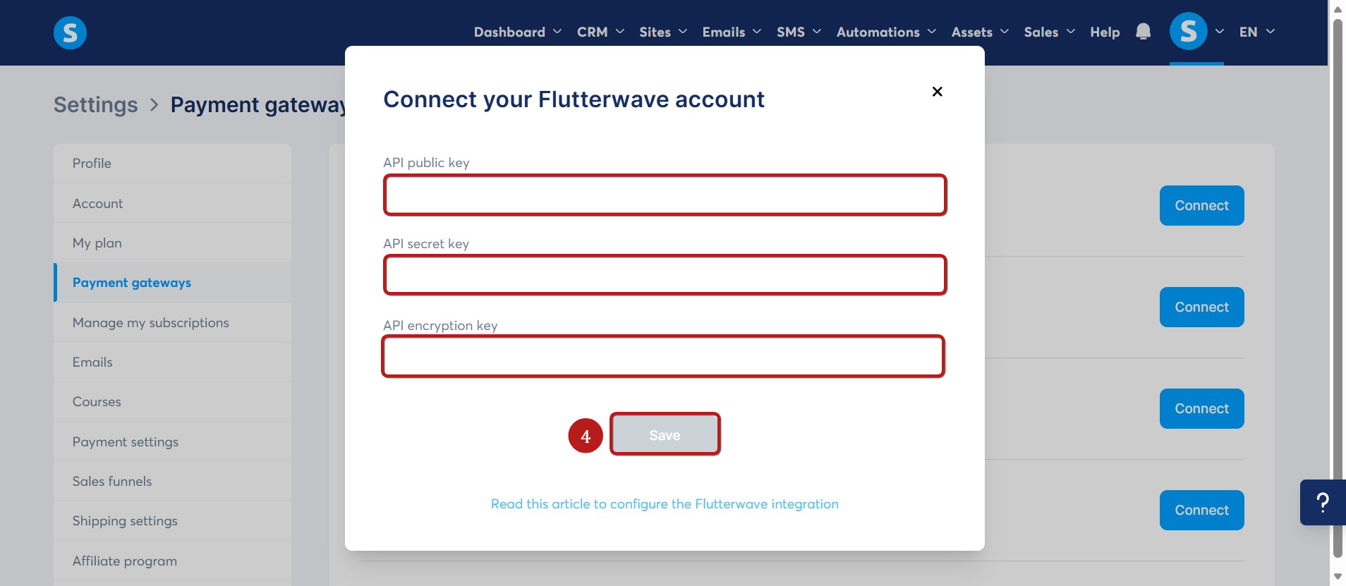 - Додайте свої облікові дані Flutterwave до свого облікового запису systeme.io та натисніть Зберегти (4).