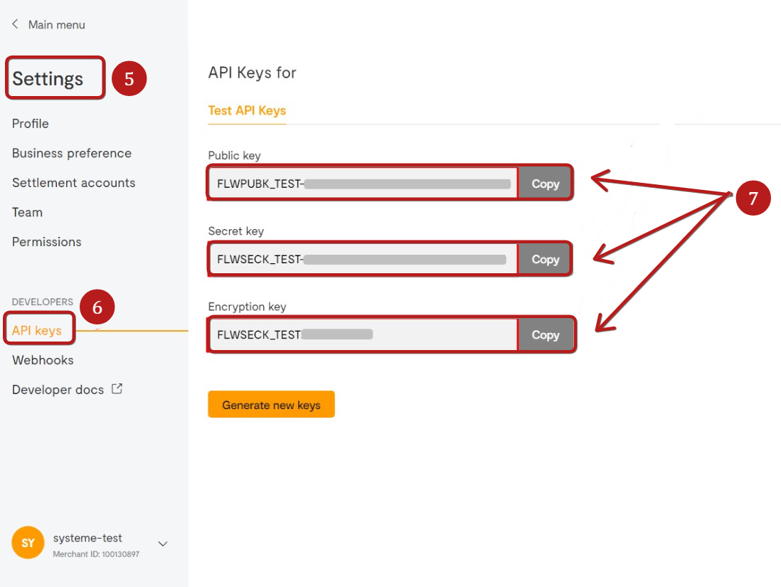 Альтернативно, ви можете увійти у свій обліковий запис і перейти на https://app.flutterwave.com/dashboard/settings/apis/live, щоб згенерувати та скопіювати API ключі.