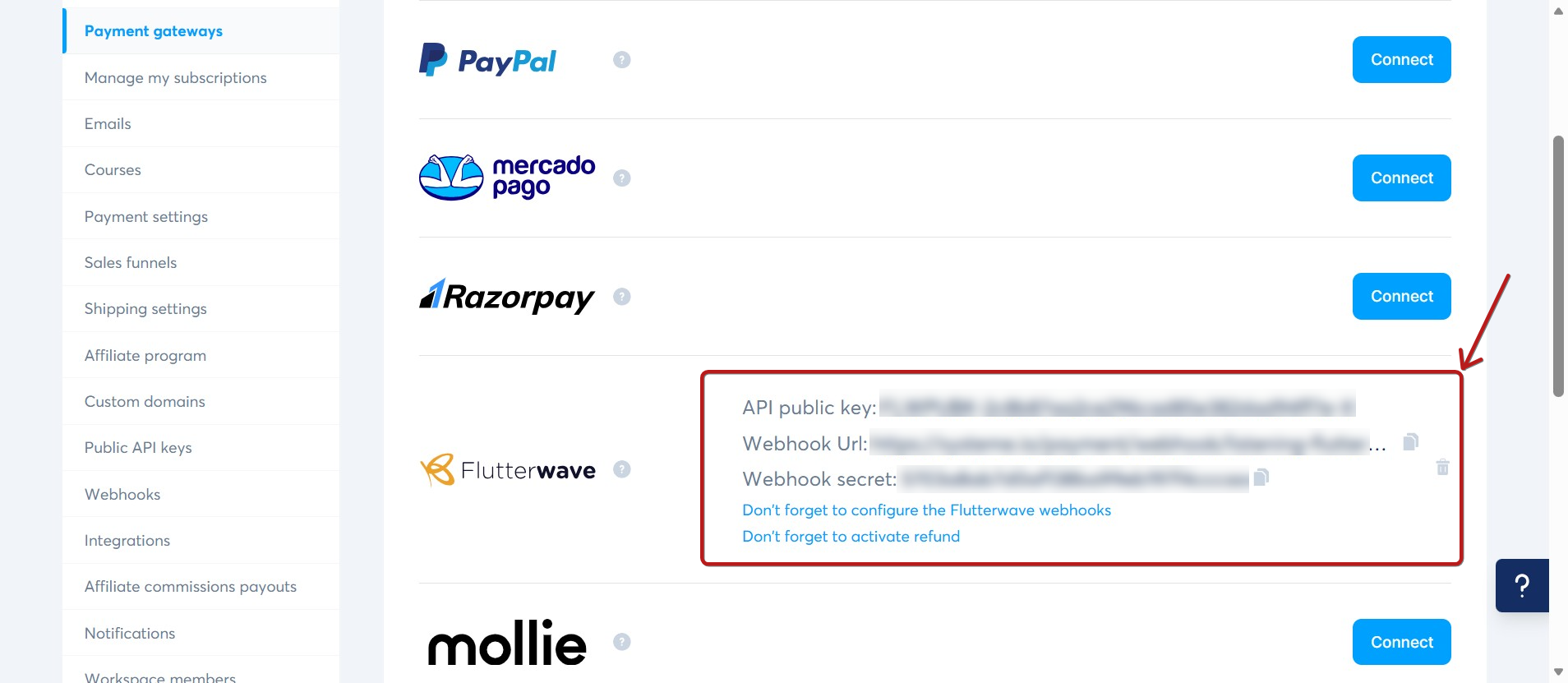 - Скопіюйте URL вебхука та секрет вебхука з розділу Flutterwave у вашому обліковому записі systeme.io.