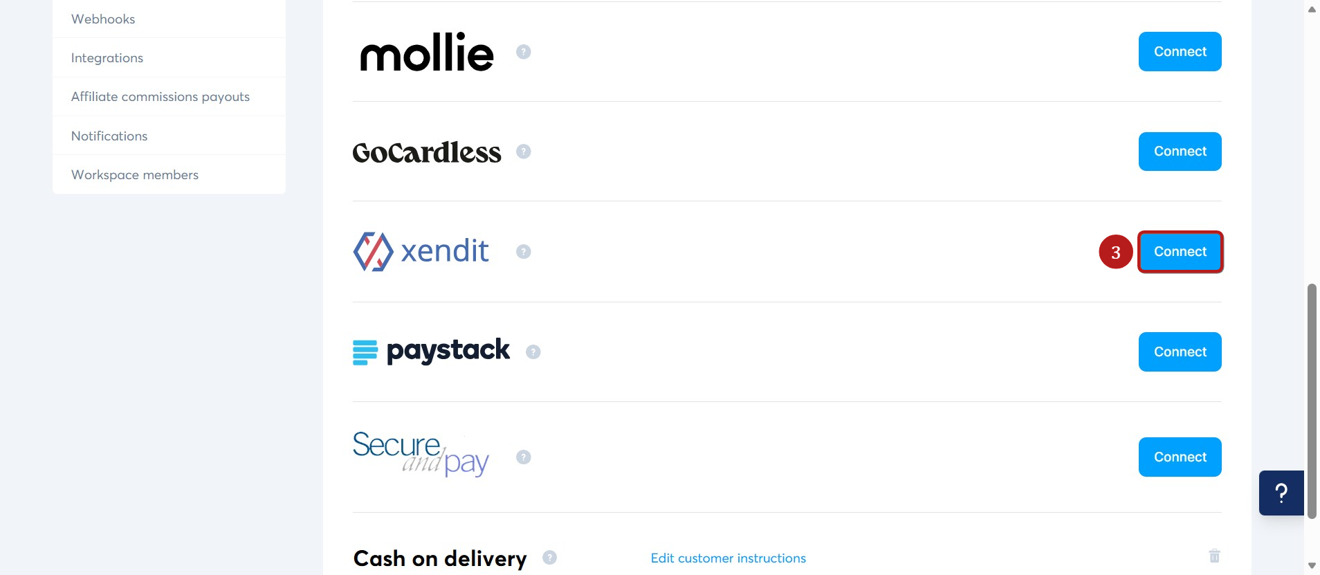 На сторінці опцій платіжних шлюзів натисніть Підключити для опції Xendit (3).