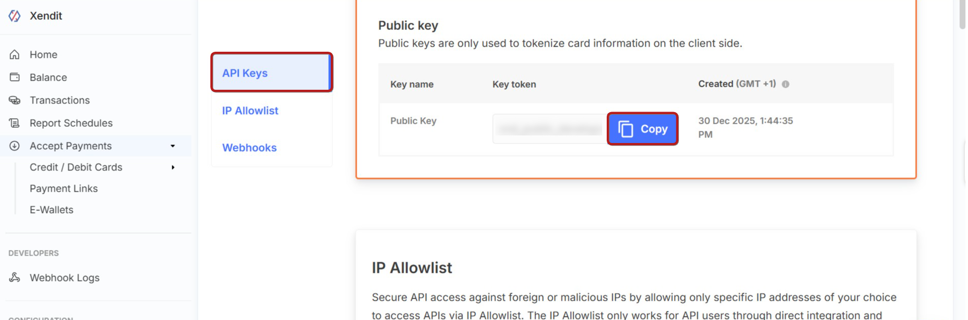 Натисніть Копіювати на синій кнопці під Публічний ключ, щоб інтегрувати шлюзи Xendit у ваш обліковий запис systeme.io.
