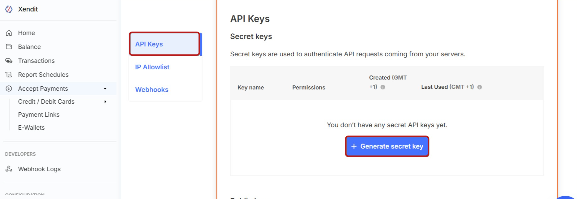 | a) Введіть бажану назву API ключа b) Виберіть дозволи API ключа нижче 1. Продукти надходження грошей: Запис 2. Продукти виведення грошей: Читання 3. Баланс: Читання 4. Звіт: Запис 5. Транзакція: Читання 6. xenPlatform * Обліковий запис: Запис * Власник облікового запису: Запис * Розділені платежі: Запис 7. xenShield: Запис c) Натисніть Згенерувати ключ, щоб скопіювати свій секретний API ключ та додати його у спливаюче вікно у вашому обліковому записі systeme.io для інтеграції шлюзів Xendit |