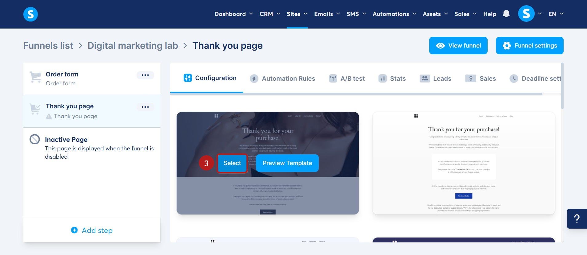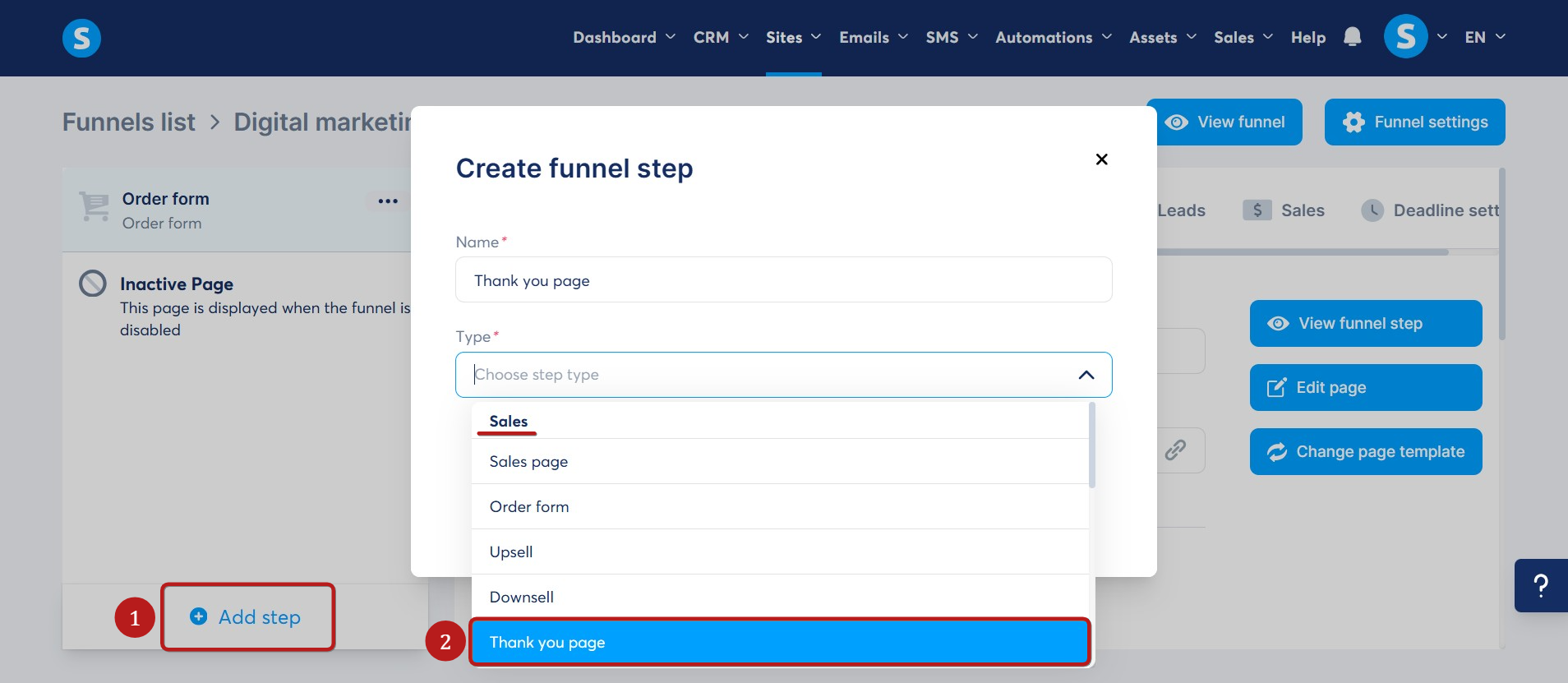 Почніть з додавання нового кроку до вашої воронки продажів (1), потім виберіть Сторінка подяки у категорії Продажі (2).
