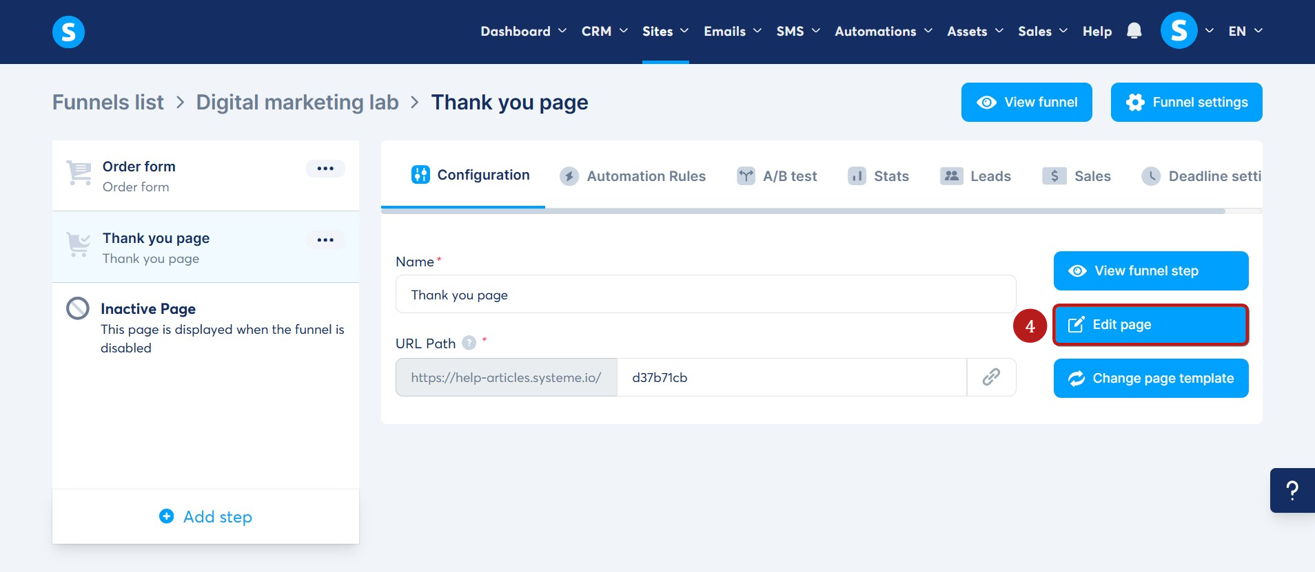 Після створення сторінки Дякуємо натисніть Редагувати сторінку, щоб відкрити редактор сторінки (4).