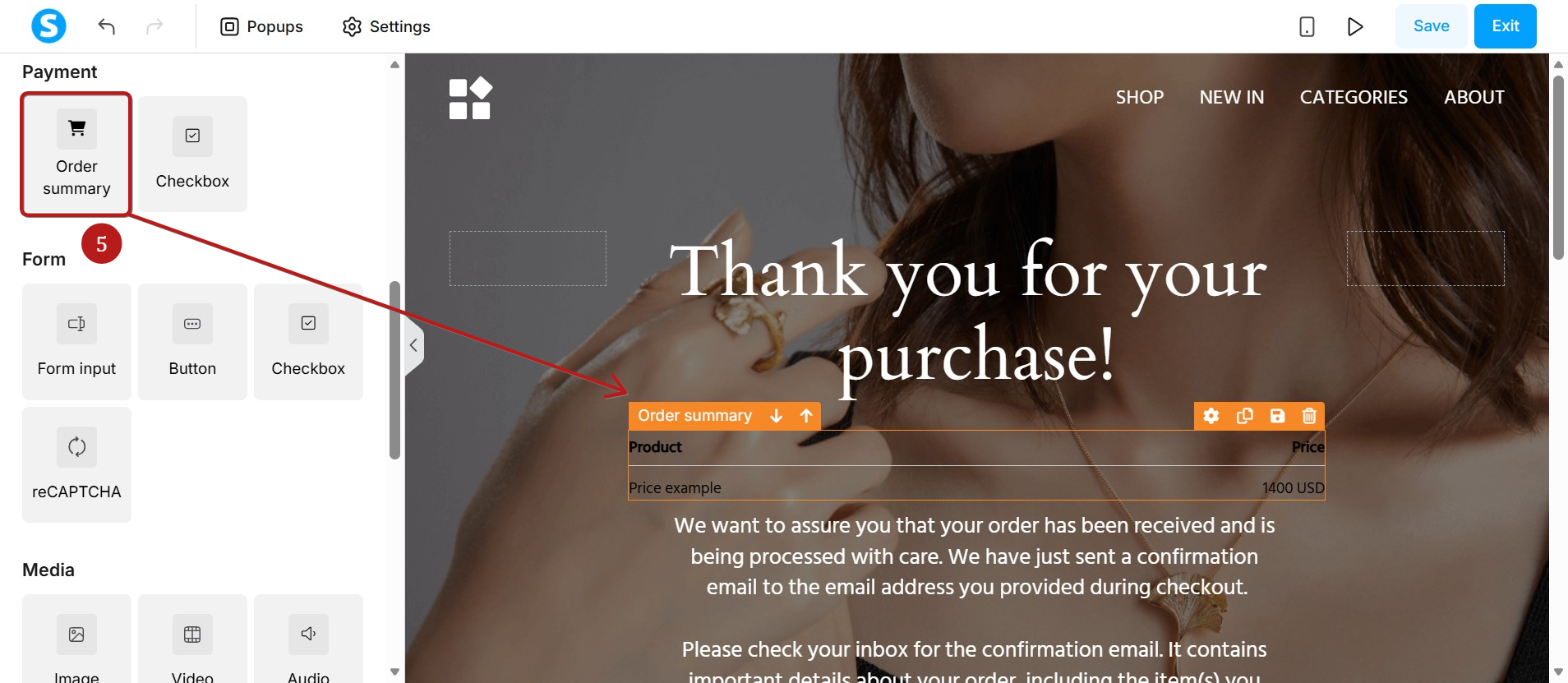 З панелі зліва перетягніть елемент Підсумок замовлення (5)і перемістіть його на сторінку в місце, де ви хочете відобразити підсумок замовлення .