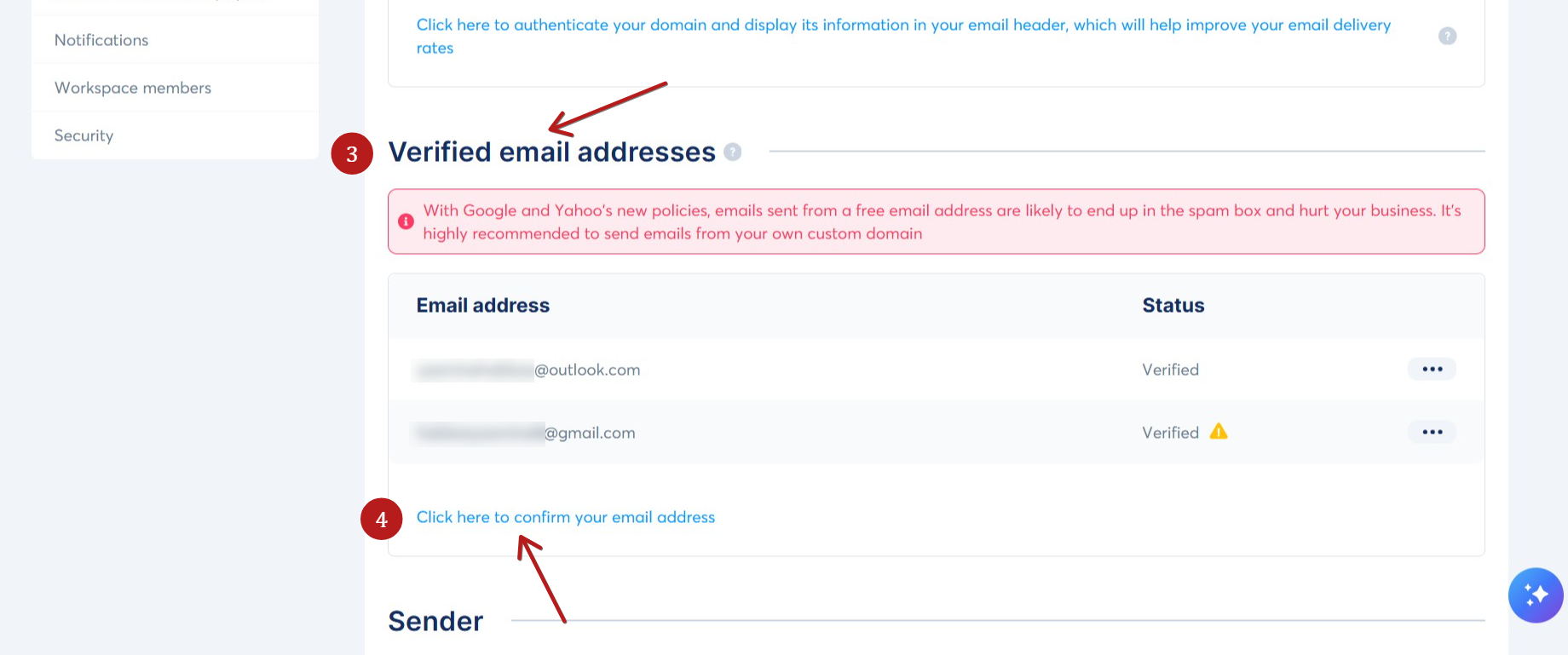 Прокрутіть униз до Підтверджені адреси електронної пошти (3), потім натисніть Натисніть тут, щоб підтвердити вашу адресу електронної пошти (4).