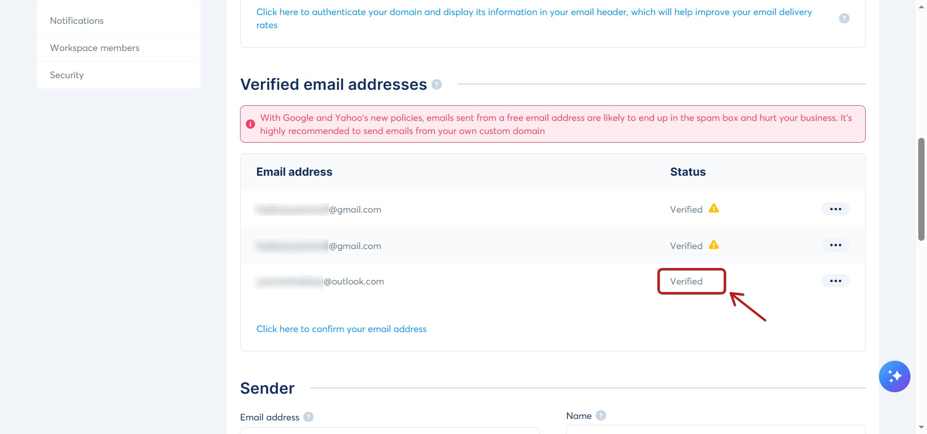 Після підтвердження статус вашої адреси електронної пошти зміниться на Підтверджено.