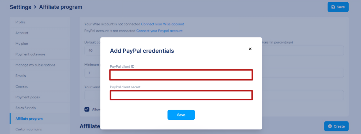 Коли у вас буде більше 25 рахунків афіліатів, які очікують на оплату, підключіть свій власний обліковий запис PayPal до systeme.io, щоб активувати автоматичні платежі: