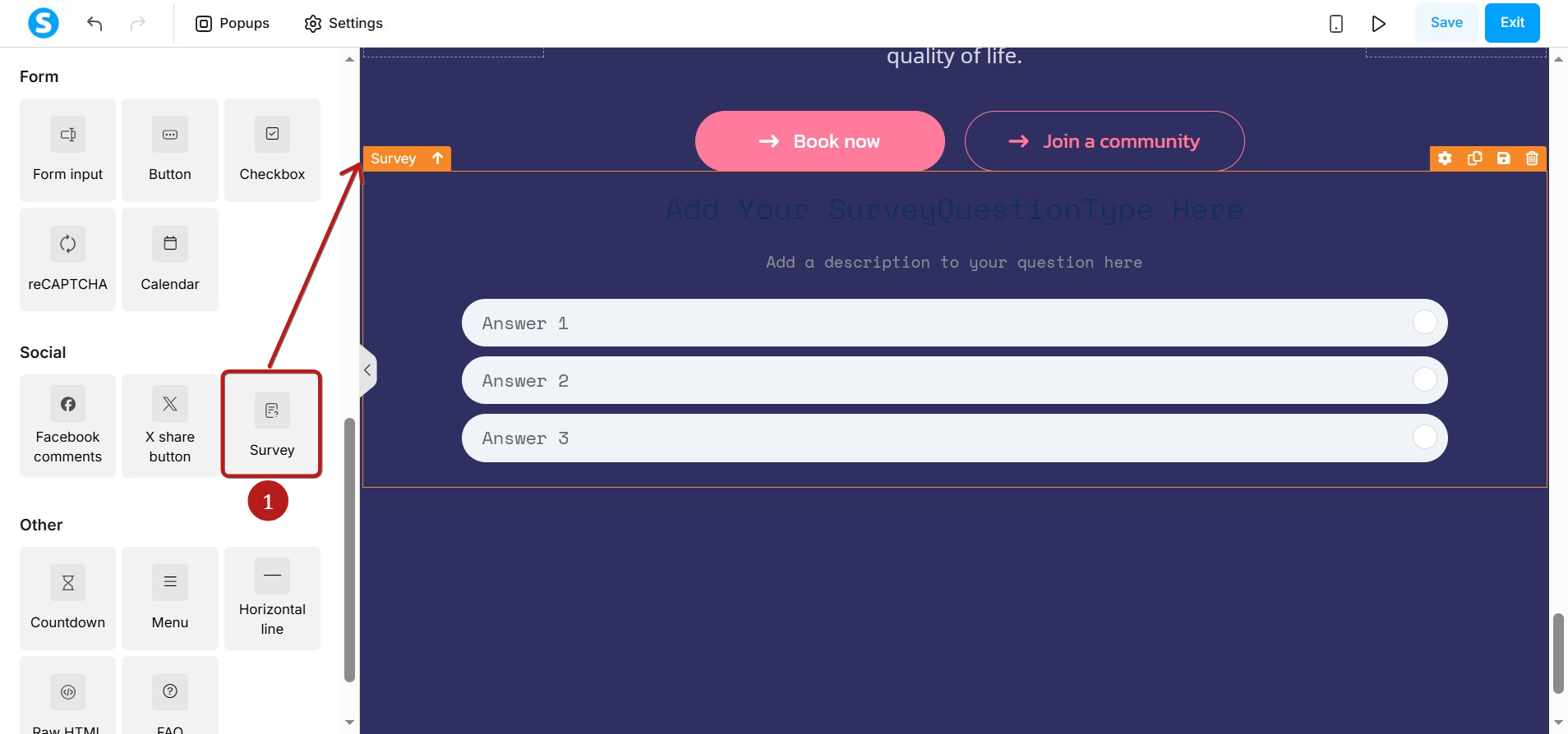 З редактора сторінок перетягніть елемент опитування з лівої панелі та перемістіть його на вашу сторінку. (1)