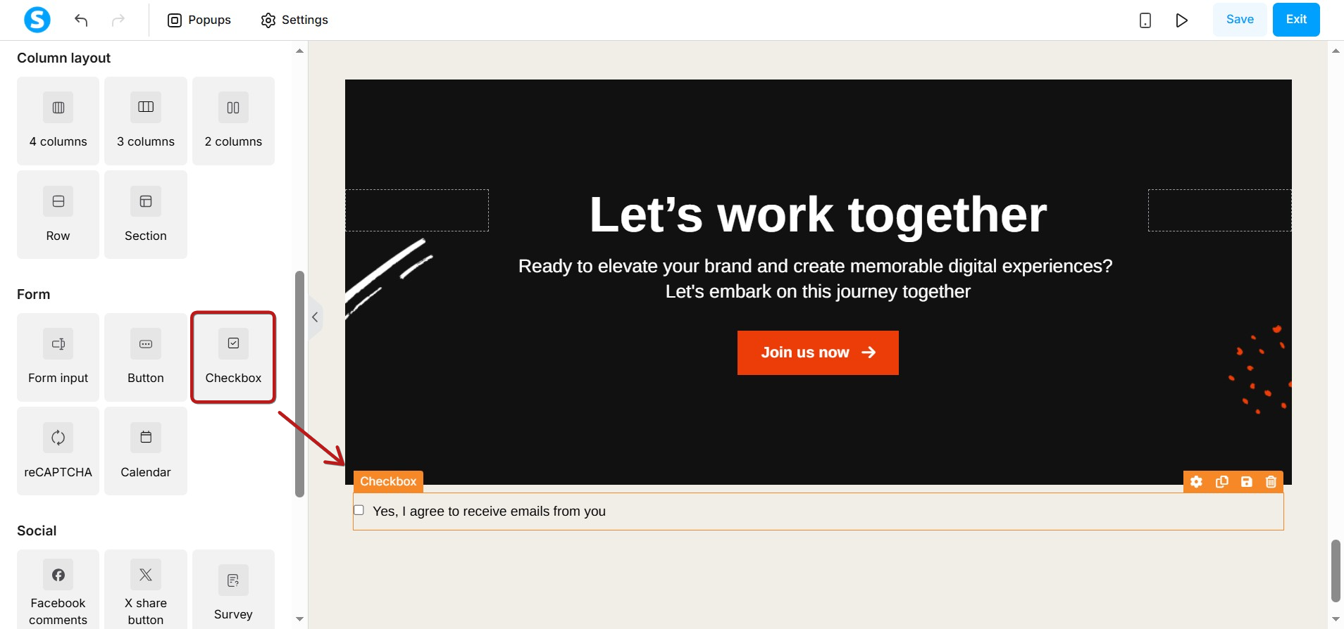 У редакторі сторінок перетягніть елемент Прапорець з панелі зліва та перемістіть його на вашу сторінку.
