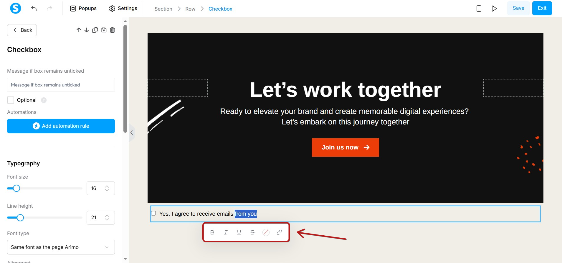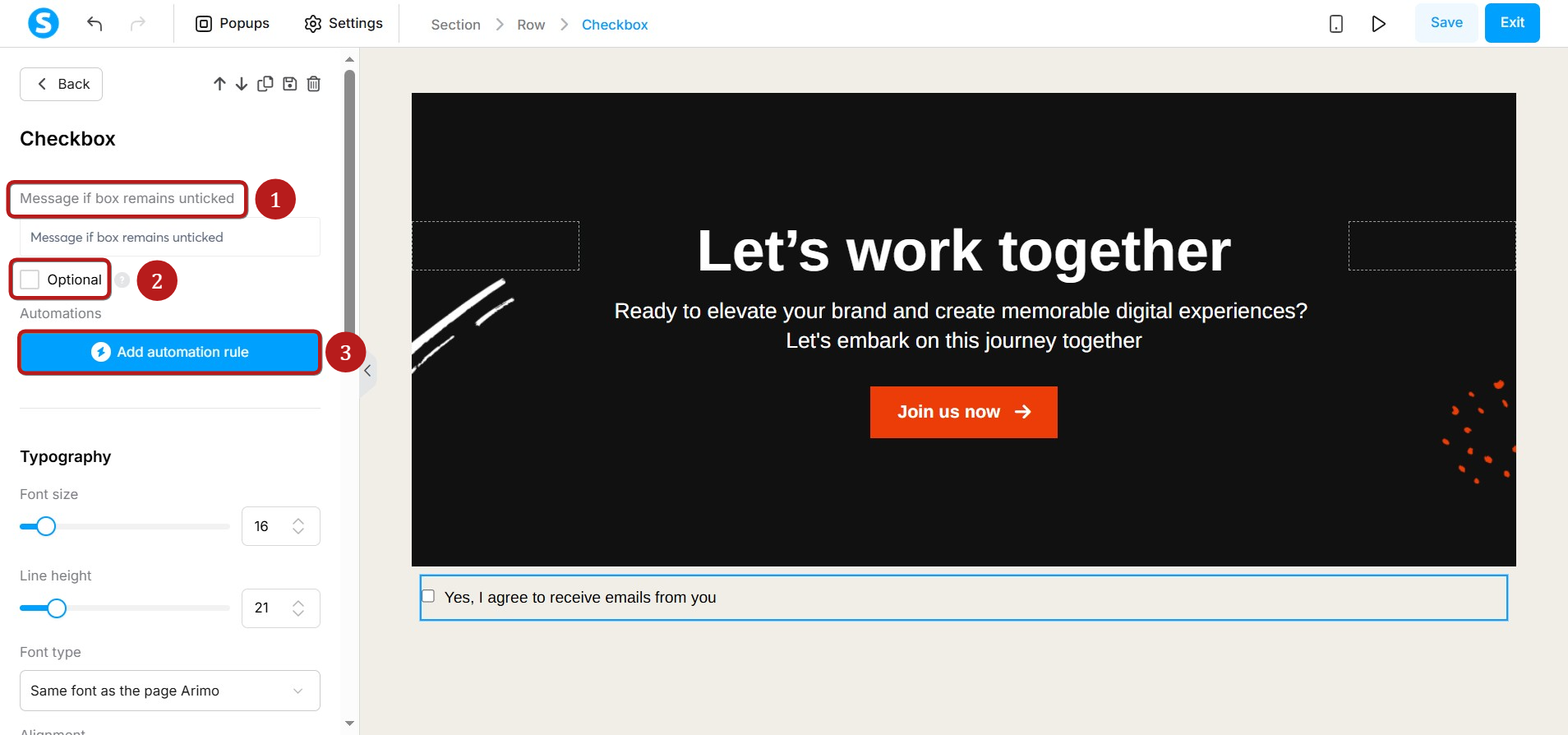 - Коли на сторінці є прапорець, налаштований як обов'язковий, а дія кнопки форми встановлена як "Відправити форму", користувач не зможе перейти до наступного кроку, якщо не встановить прапорець.